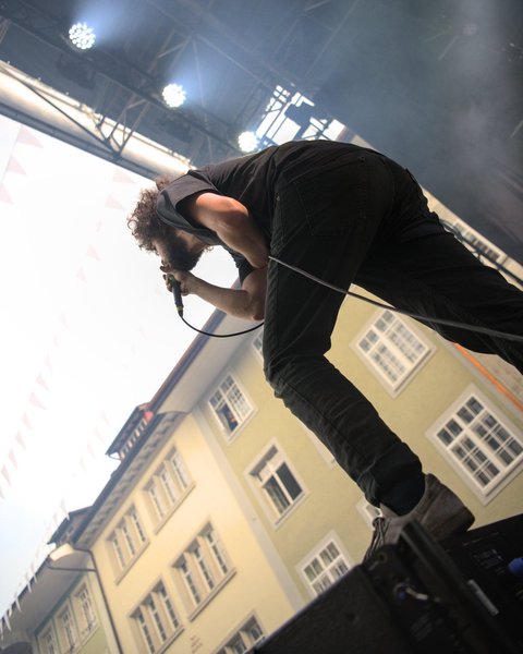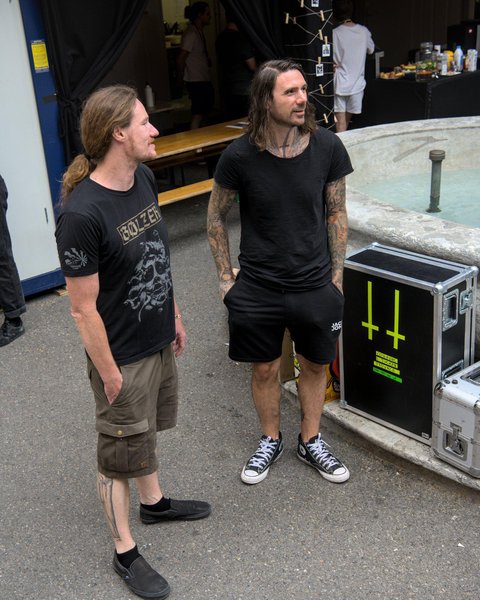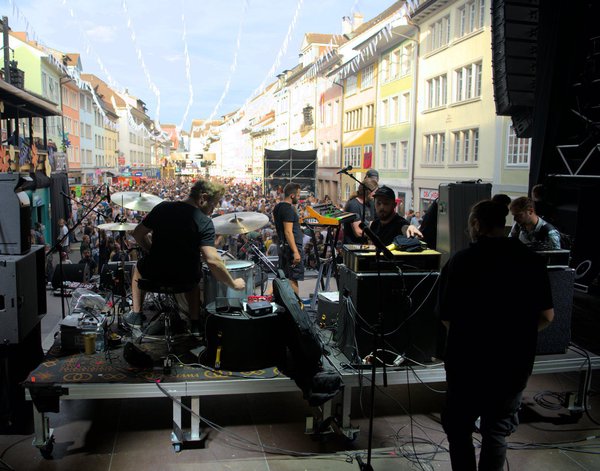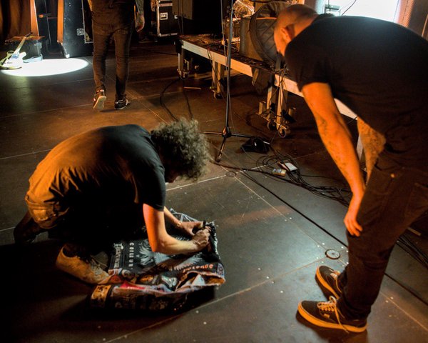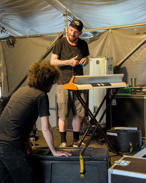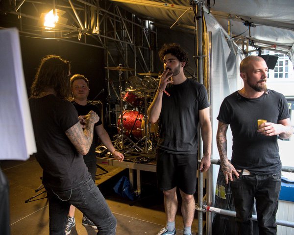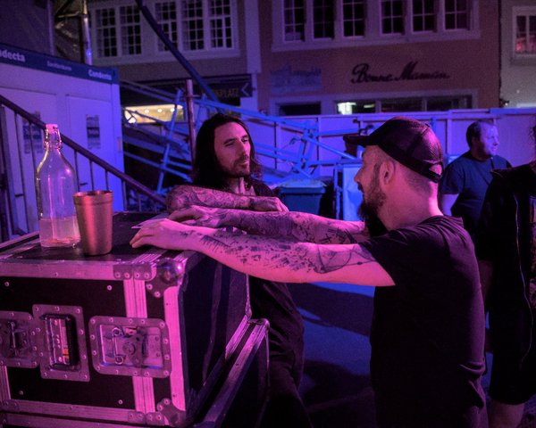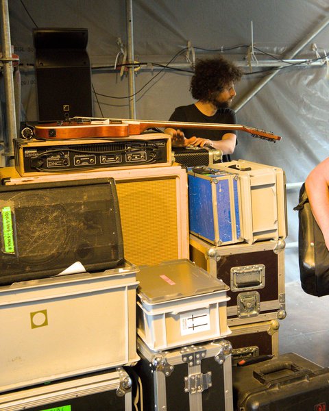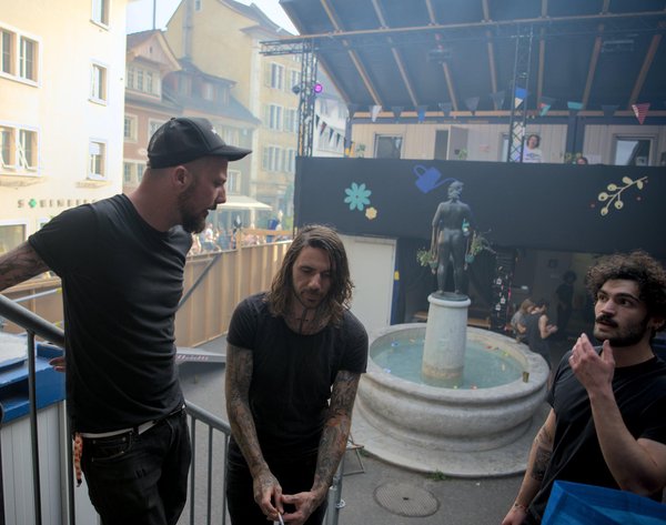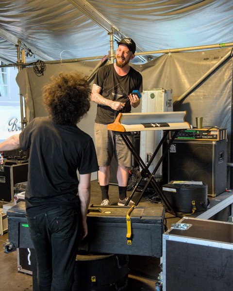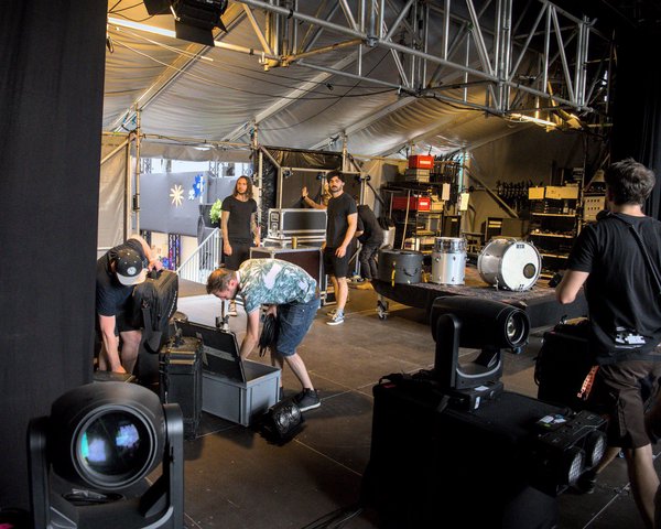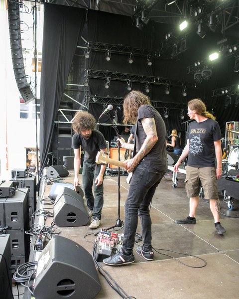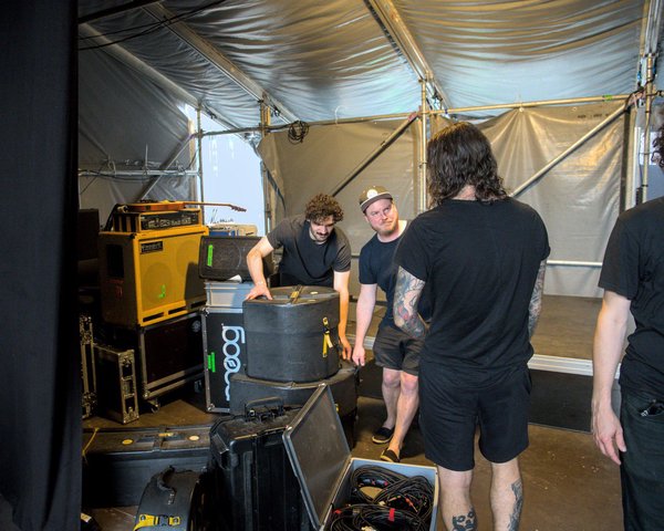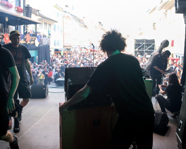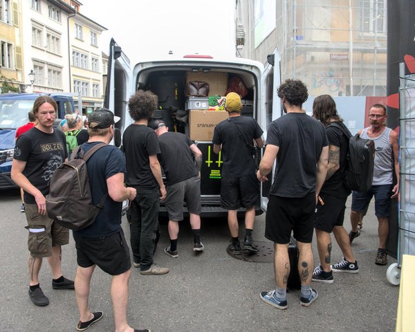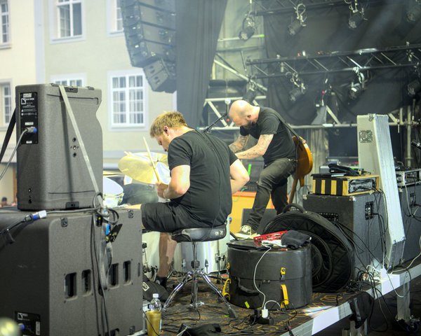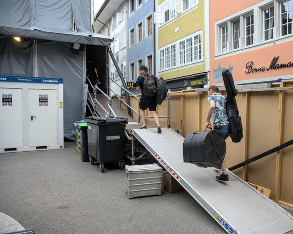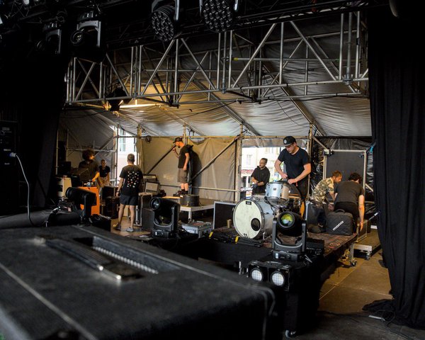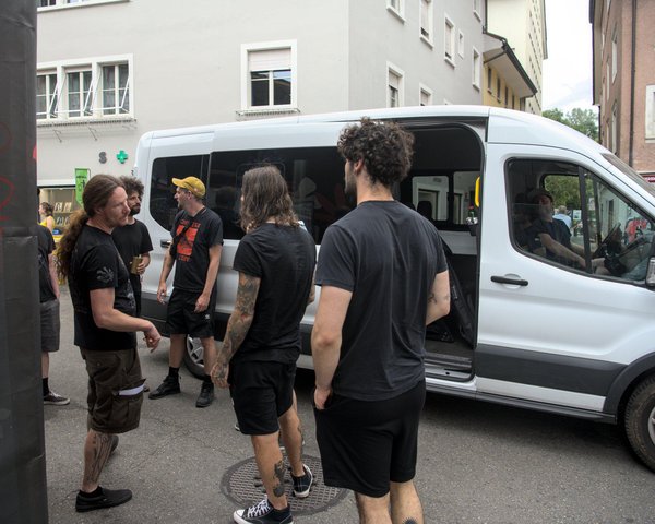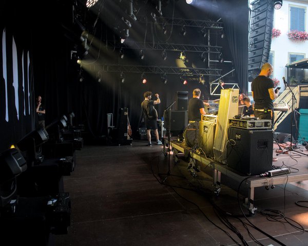 Am späteren Nachmittag ist die Band angereist, hat sich mit dem Band-Betreuer Chrigi getroffen und sogleich mit Ausladen begonnen. Daraufhin sind die Instrumente im hinteren Bereich der Bühne aufgebaut worden, während im vorderen Teil die Vorband mit dem Soundcheck beschäftigt war.