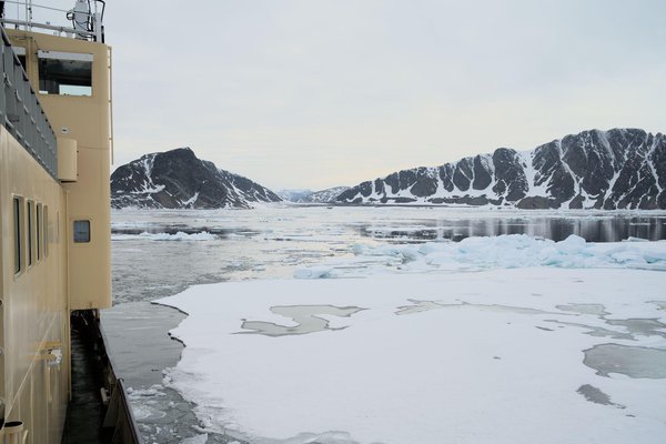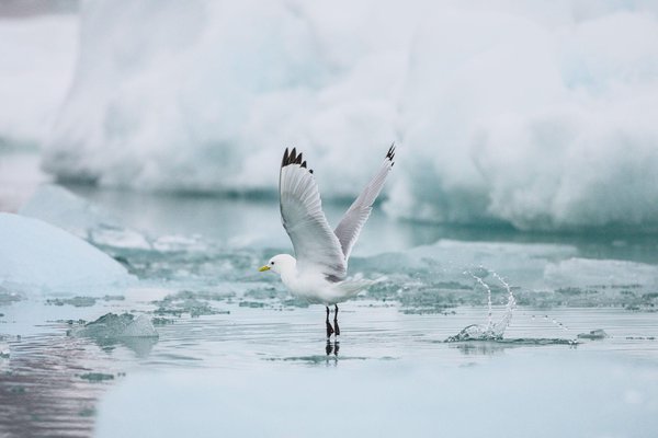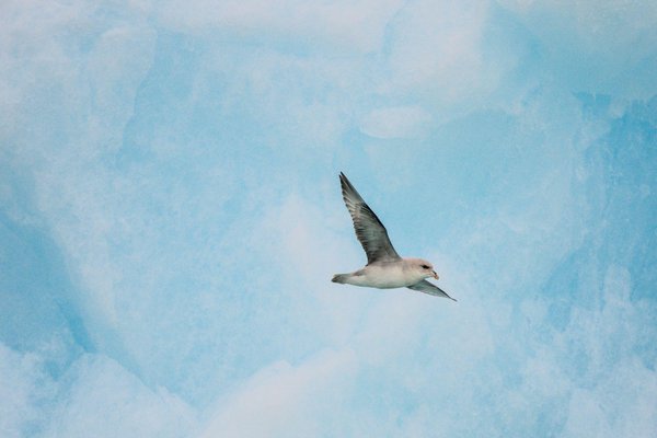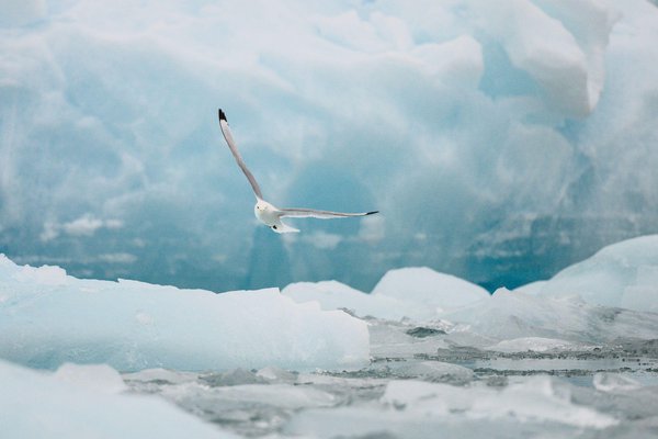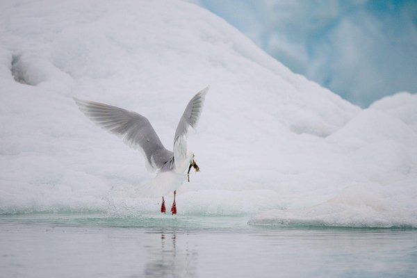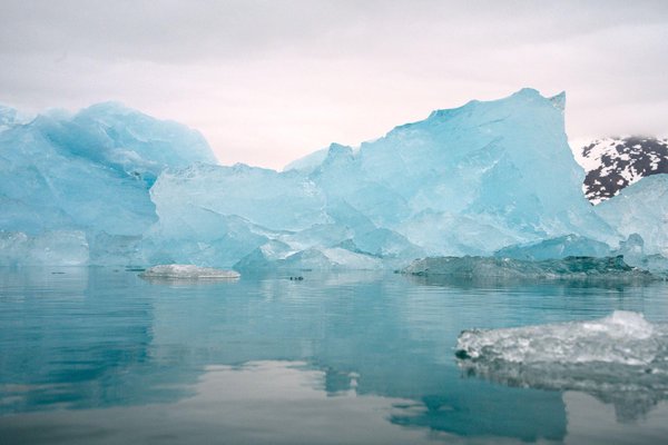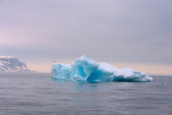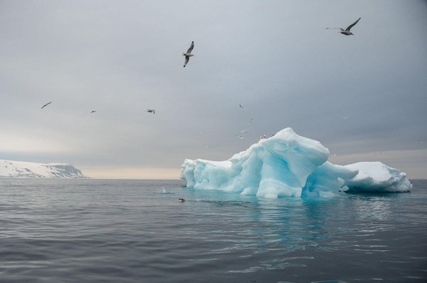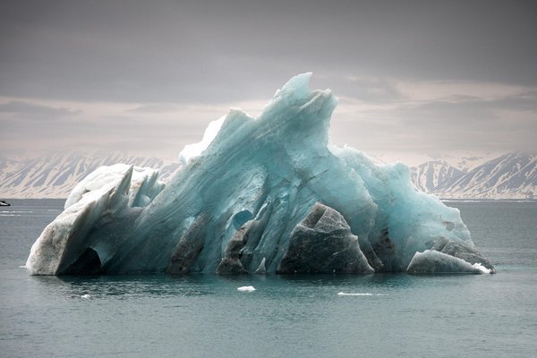 Auf Spitzbergen gibt es über 1'000 Gletscher. Wenn Gletscher ins Meer münden und dort abbrechen, so entstehen Eisberge unterschiedlicher Grössen. War der Gletscher über 60-80m dick, so ist das Eis zuunterst blau. Dies liegt daran, dass die ursprünglich mit dem Schneefall eingeschlossene Luft durch das Gewicht des Gletschers so start komprimiert wird, dass die Luftbläschen kein Licht mehr streuen. Ist dieses Blau der Luft ausgesetzt, so wird es bald durch Wind und Wetter aufgeraut und wirkt wieder weiss. Unter Wasser hingegen wird die Oberfläche quasi poliert und leuchtet dann in tiefstem blau. Am interessantesten sind daher blaue Eisberge, die sich kürzlich gedreht haben und daher derjenige Teil an der Oberfläche ist, welcher zuvor unter Wasser war.